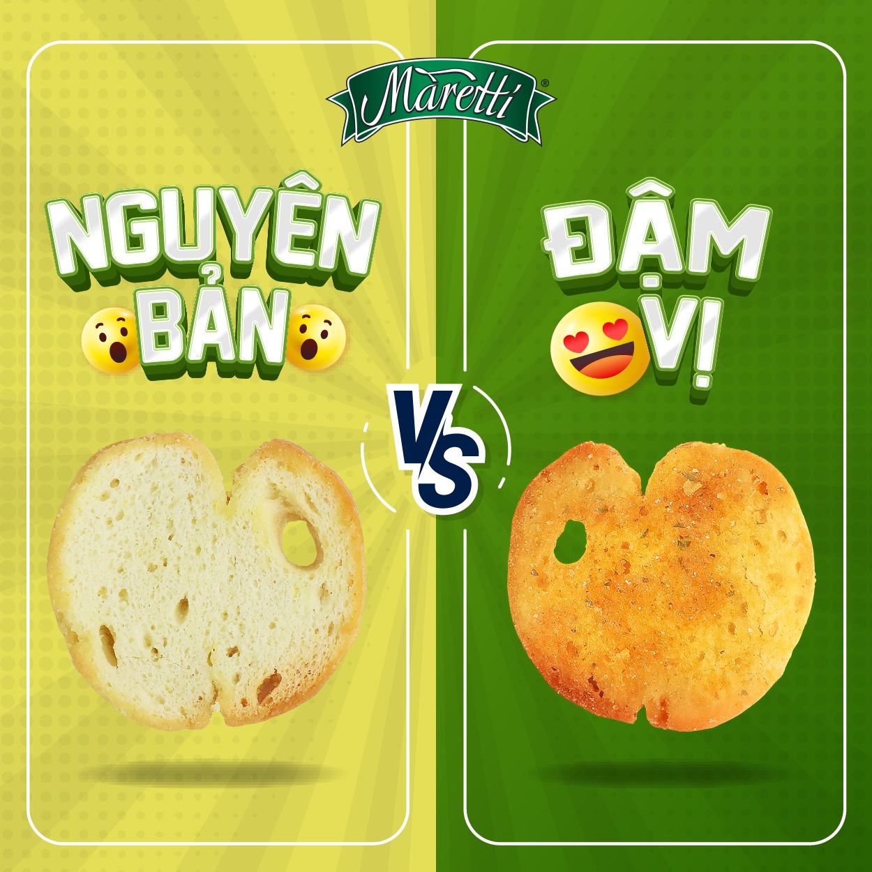 Hai mặt hương vị trong một lát bánh, công thức nướng thủ công 2 lần để tạo độ giòn rụm hoàn hảo. Khi lát bánh mì nướng Maretti đặt trên đầu lưỡi, bạn sẽ phải “oh wow” vì ấn tượng bởi vị mặn độc bản làm vị giác bùng nổ. Bảng thành phần với nguyên liệu 100% thuần chay, không chiên dầu đảm bảo sự phù hợp tối đa với mọi đối tượng.